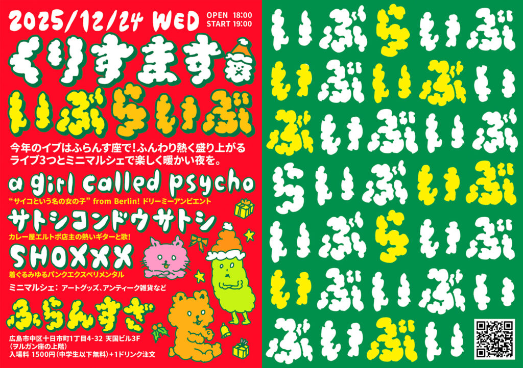 スペシャリゲストはベルリンから一時帰国中の「a girl called psyco」!迎え撃つ広島勢は、シュールな歌詞を熱く歌う呉のエルトポカレー店主サトシコンドウサトシと、元ベルリン市民で現海田町民のゆる着ぐるみパフォーマーSHOXXX!
