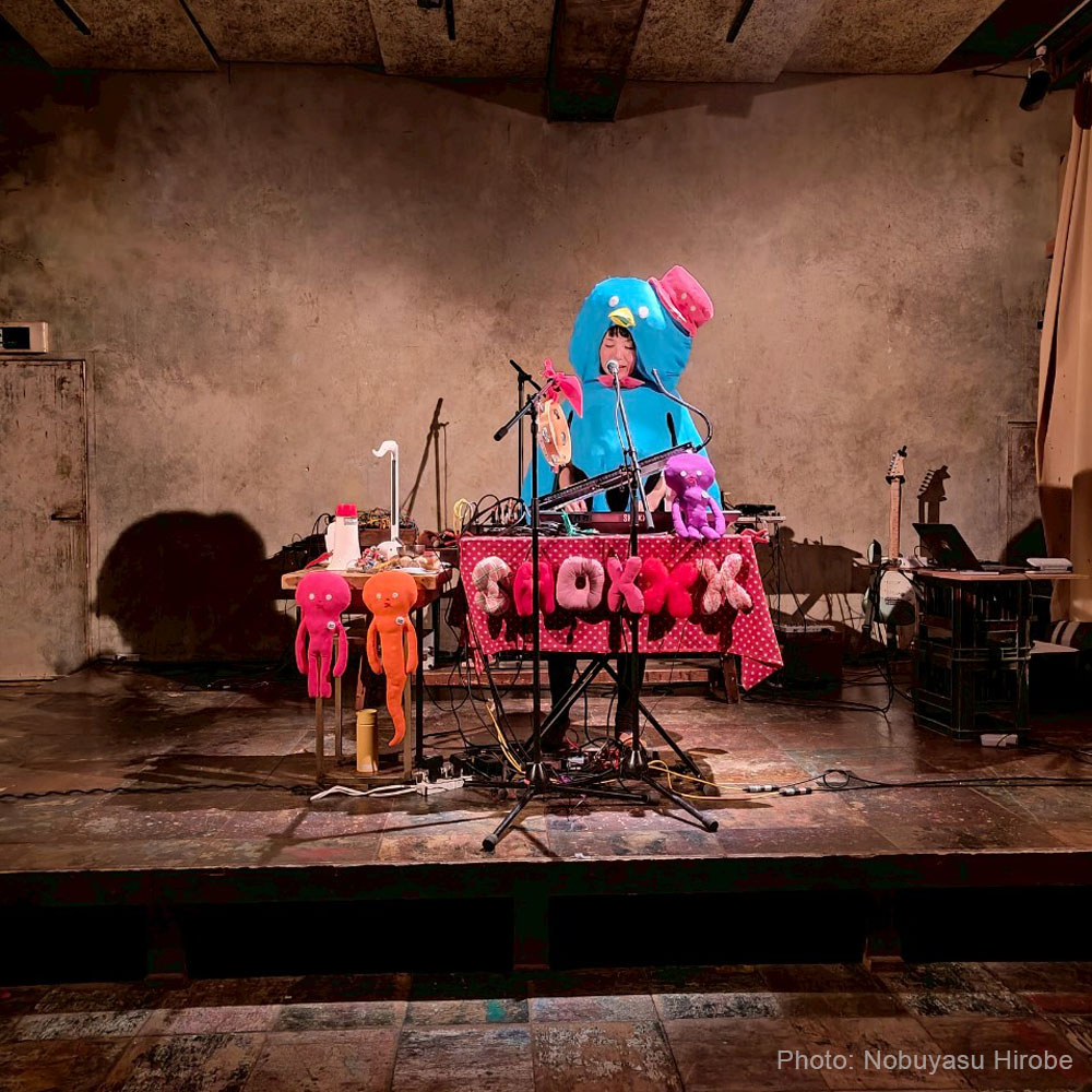 2005年から18年間ベルリンでアーティスト、キュレーターなどとして活動、2024年から広島拠点。メロディカ、キーボード、ルーパー、小楽器を使い、日英独語の自由奔放な歌詞を歌う。自作着ぐるみを着たパペットバンド「Puppe’n Mucke」の活動と並行してソロも開始。パンク&DIY精神が光る、ポップと実験の間を行き来する独特の存在。
